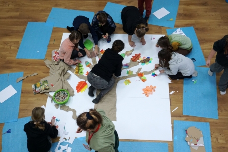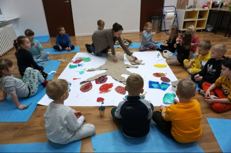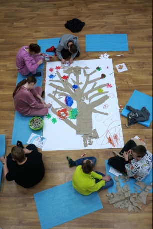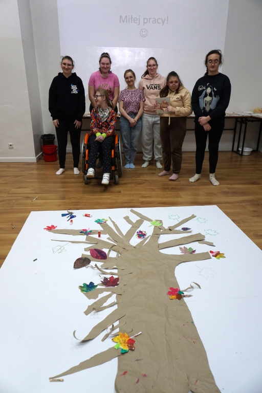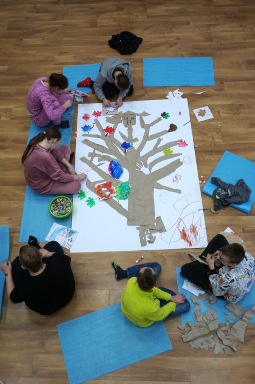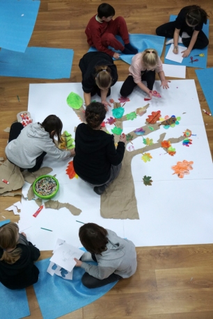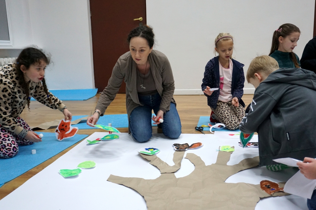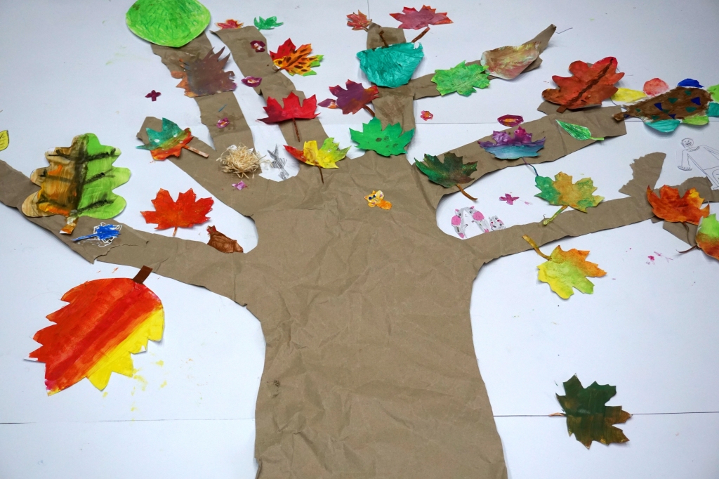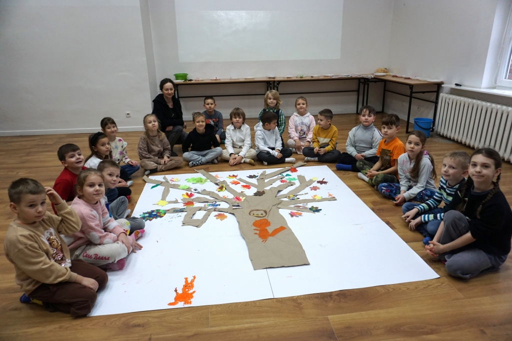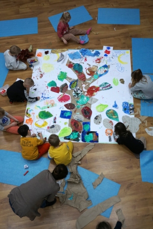 Po krótkim wprowadzeniu, dzieci namalowały indywidualnie detale potrzebne do stworzenia fantastycznego drzewa. Następnie wykleiły na dużym formacie pień oraz gałęzie drzewa i dzieci zajęły się kompozycją, przyklejając przygotowane wcześniej elementy.