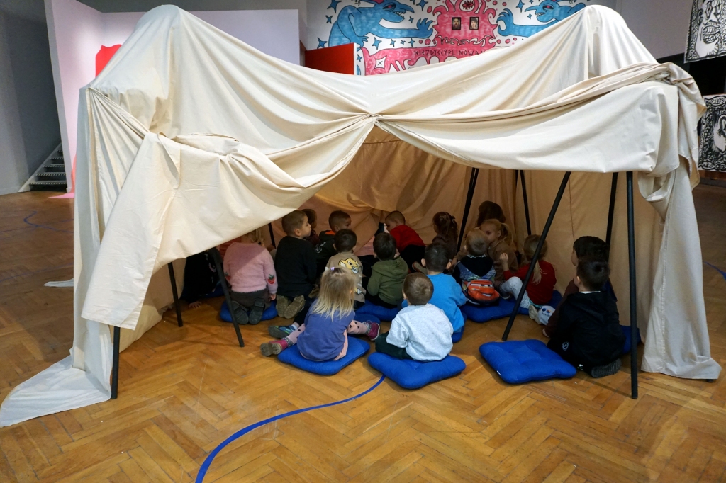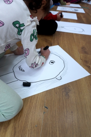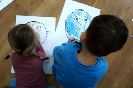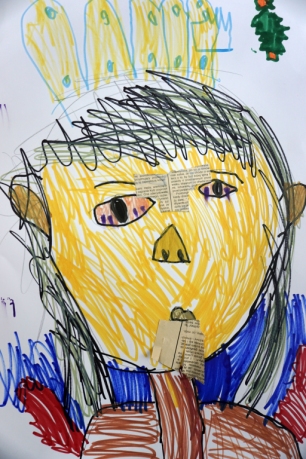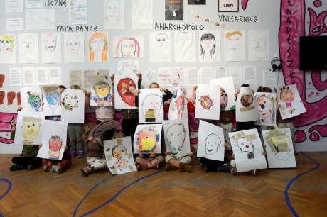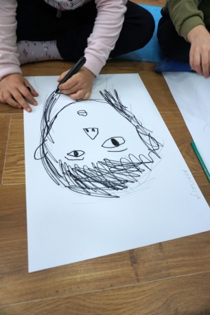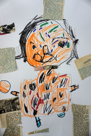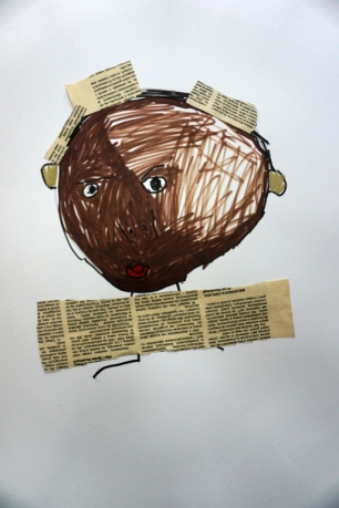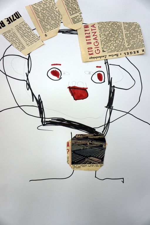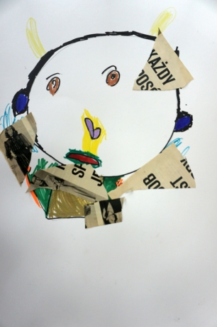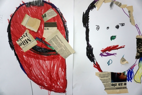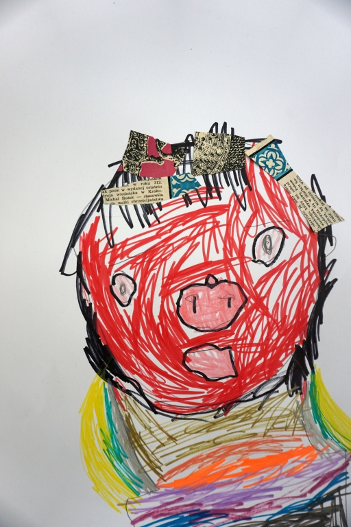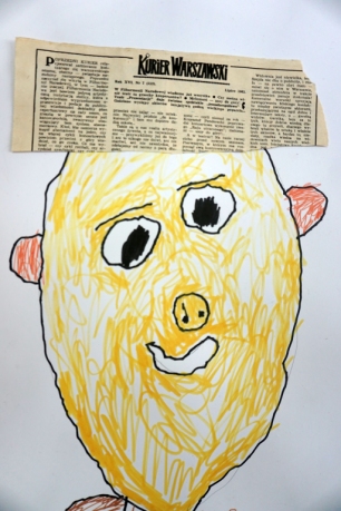 Podczas kolejnych warsztatów SZTUKowanie dzieci obejrzały wystawę PAPA, na której mogły wypowiedzieć przez mikrofon ważne dla siebie sprawy i schować się w bazie. Inspiracją do warsztatów stały się autoportrety artystów biorących udział w wystawie. Dzieci stworzyły swoje rysunkowe atoportrety. Na koniec dodały elementy kolażowe ze starych gazet.