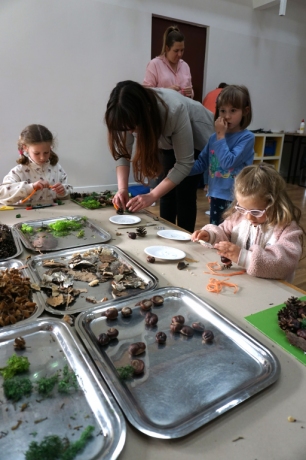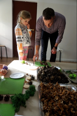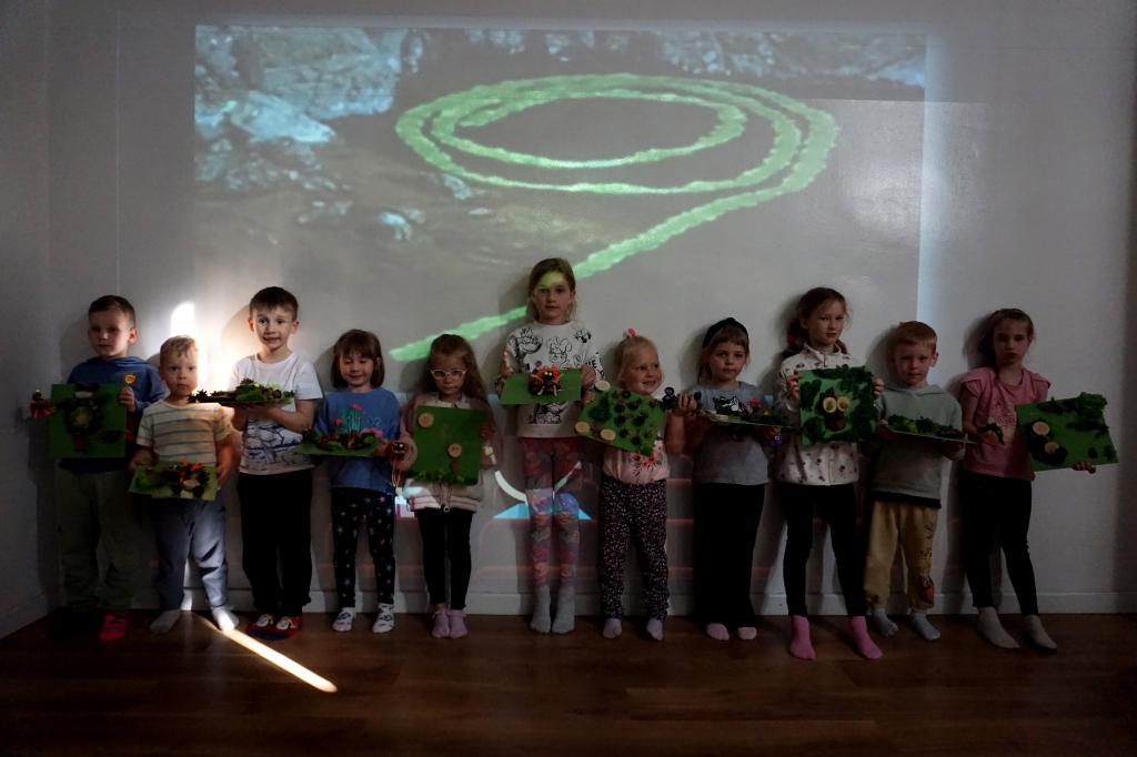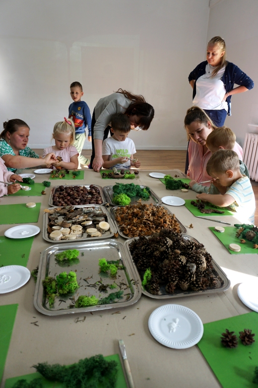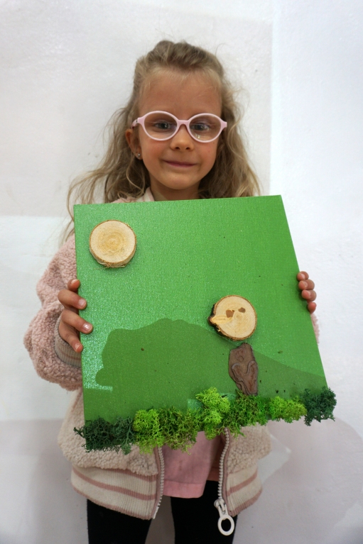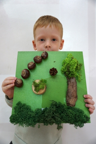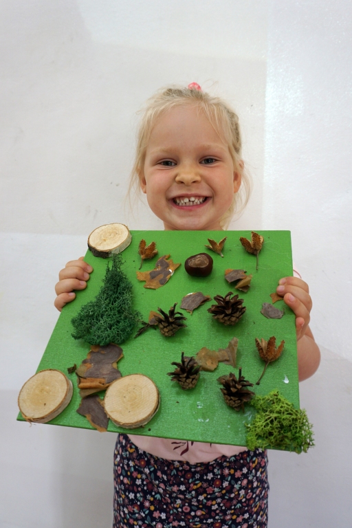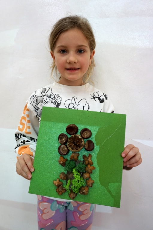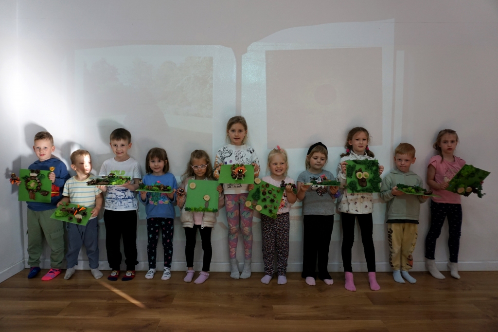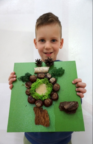 Dzieci poznały twórczość tego artysty i jego sposoby pracy. Niestety warunki pogodowe uniemożliwiły przeprowadzenie zajęć na dworze, ale dzieci z naturalnych materiałów takich jak szyszki, kasztany, łupinki bukowe, kora i mech stworzyły swoje prace. A komu pozostał czas mógł jeszcze stworzyć leśnego ludzika.