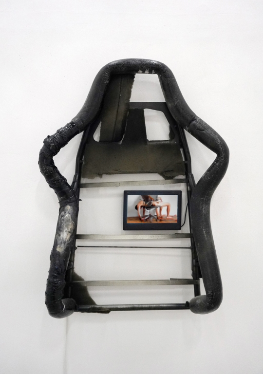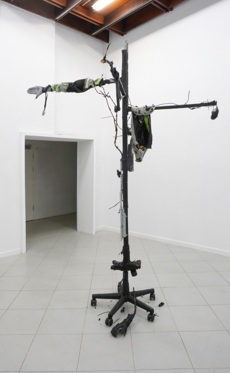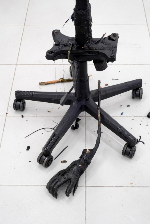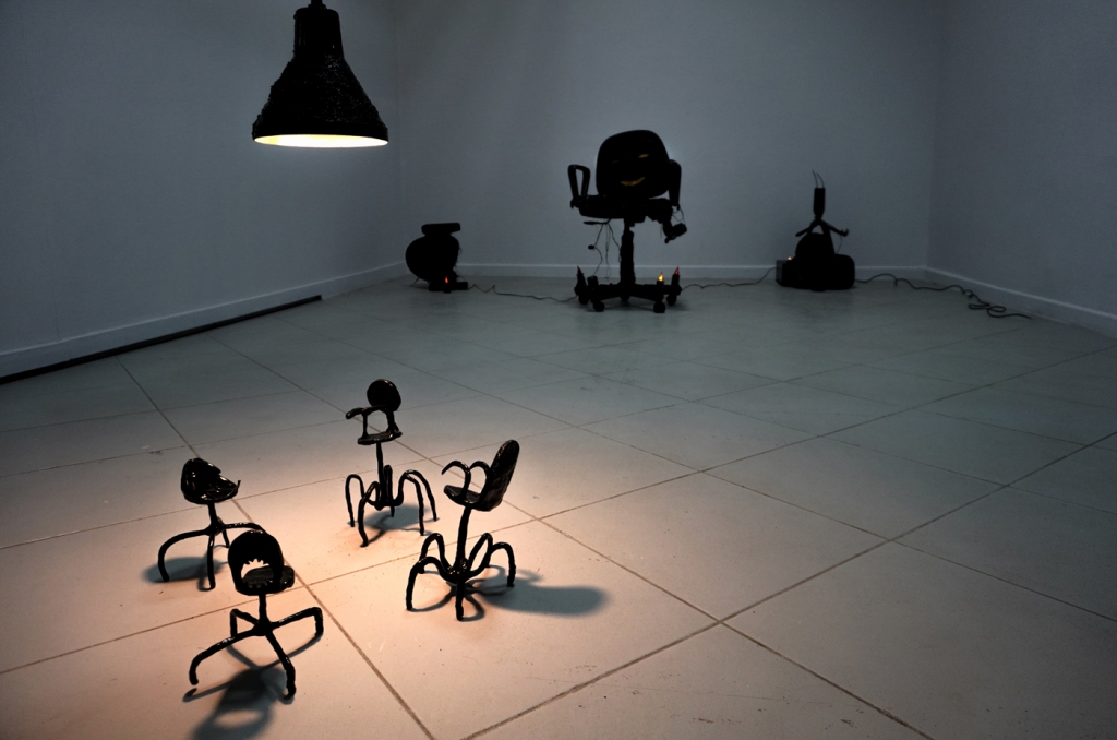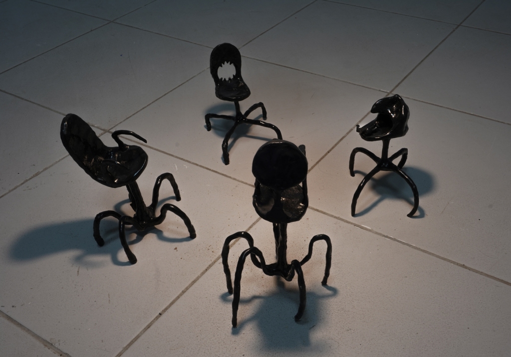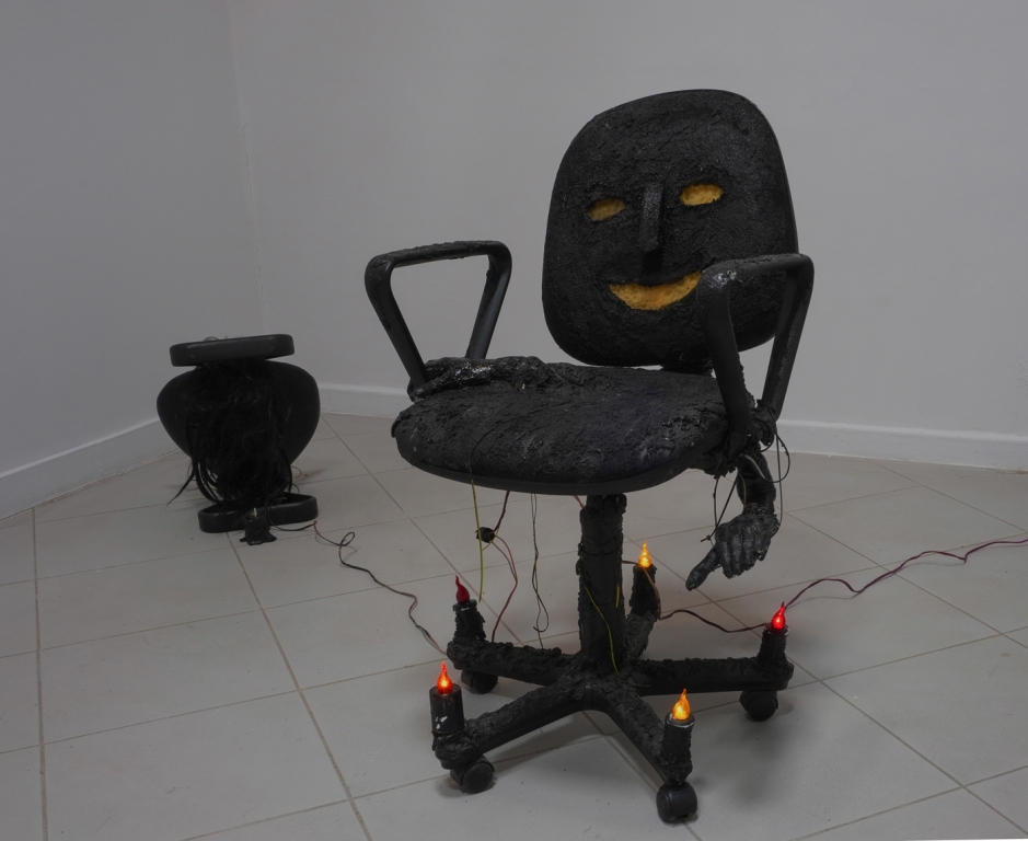 Jednym z istotniejszych elementów kultury materialnej współczesnego społeczeństwa informacyjnego, powszechnym w wystroju wnętrz mieszkań, biur i pracowni, jest fotel biurowy. Mebel ten, wraz z jego podgatunkiem znanym jako fotel gamingowy, są współodpowiedzialne za rozmycie rozgraniczenia między rekreacją, a pracą. Choć oczywiście, w tym aspekcie smartfony biją krzesła komputerowe na głowę, to wspominam o tym pracowniczo-rekreacyjnym siedzisku ze względu na przestrzenne uwiązanie oraz uniformizację użytkowania, na które zwraca uwagę Żarski. Artysta w swojej praktyce przywołuje demona-fotel biurowy, Czuwającego, który, jak sam o nim pisze, jest późno kapitalistycznym demonem, symbolizującym współczesne wyczerpanie, wątpliwości niepokoje i lęki, które nawiedzają współczesne społeczeństwa neoliberalne.
