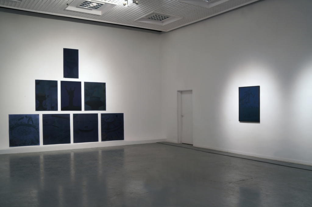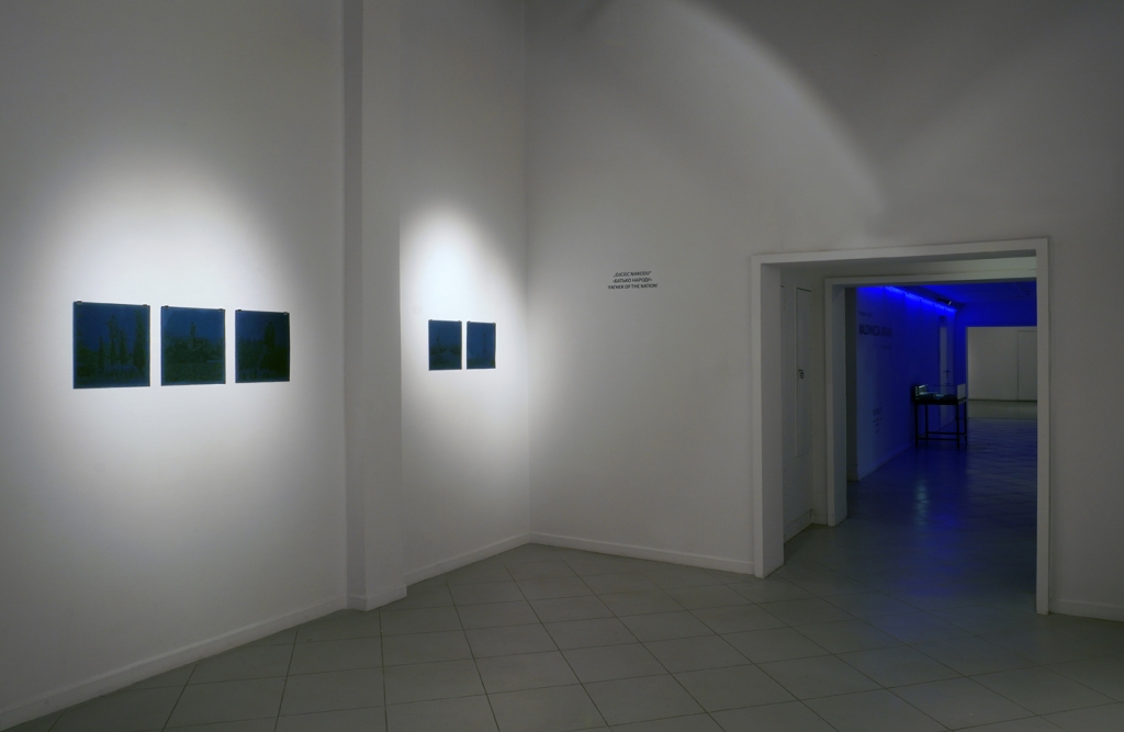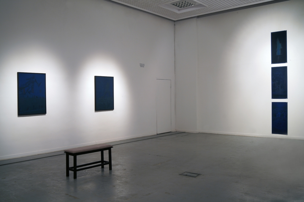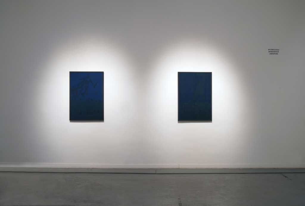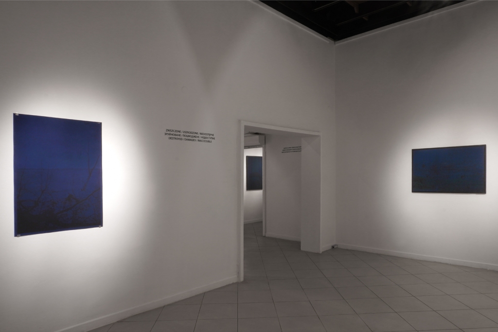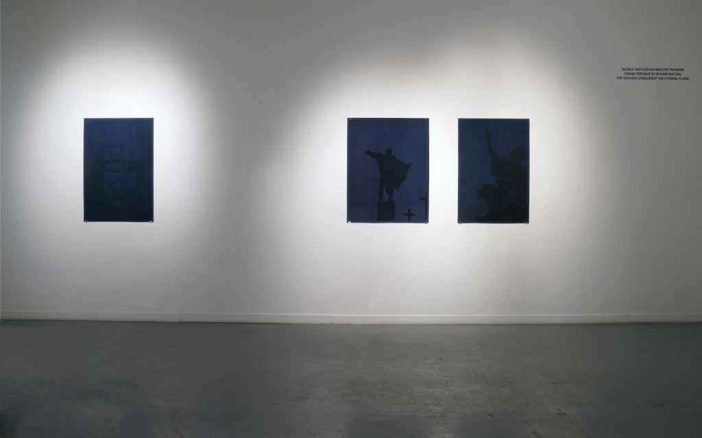 Postcards and photo albums were one of the methods of reinforcing the presence of propagandistic content. They were an important part of their distribution, as evidenced by the fact that their publication required multi-step approvals from the authorities. Biley enlarges them and creates works with the use of cyanotype – a photographic technique in which, when exposed to light, an image in a shade of Prussian blue is obtained, creating a twilight effect. The works look as if the photographs were taken after dusk or at dawn. The artist deliberately does not clarify this. He obscures the images of the objects and structures that created a false narrative. In recent years, most propaganda monuments have been removed from public space and their message is perpetuated no longer through peaceful transition, but through wartime aggression. In addition to themes connected to the history of Ukraine from the period of the Soviet Union, the series also includes images of structures destroyed by the Russians after the invasion in 2022 – the Azovstal factory in Mariupol the port of Odesa, whether the world’s largest transport aircraft Mriya (An-255) – which are examples of the final solution, namely war as a continuation of the policies of Tsarist Russia and the Soviet Union towards the annexed countries. Also appearing is the Kachovets power plant, which was blown up by the russians on June 6, 2023 as a result of which the Kachov Reservoir dried up, hundreds of plant and animal species became extinct. It also led to a shortage of drinking water and drought in the entire region of southern Ukraine. Due to the flooding, the unique ecosystem of the Dnieper floodplains and downstream islands disappeared. Motor oil that leaked from blocks of the destroyed hydroelectric plant also became a threat. The catastrophe has been described as an “ecocide.”