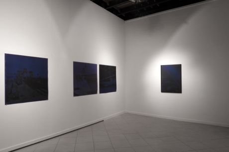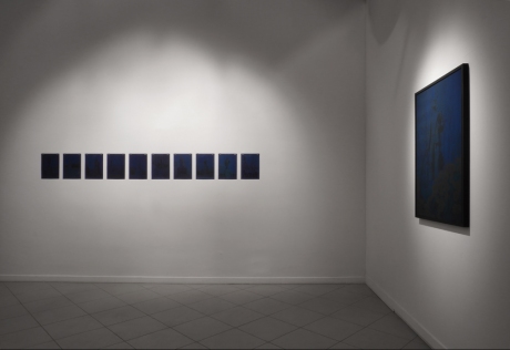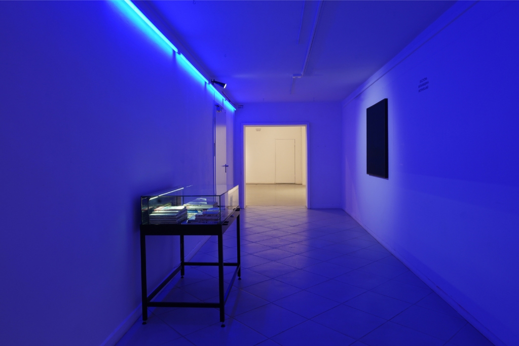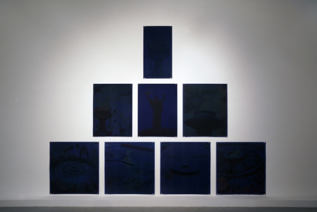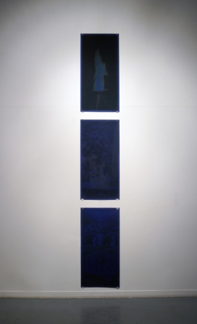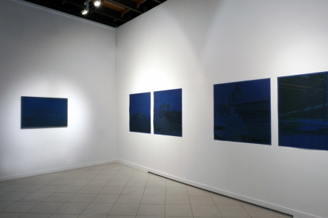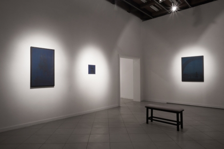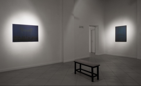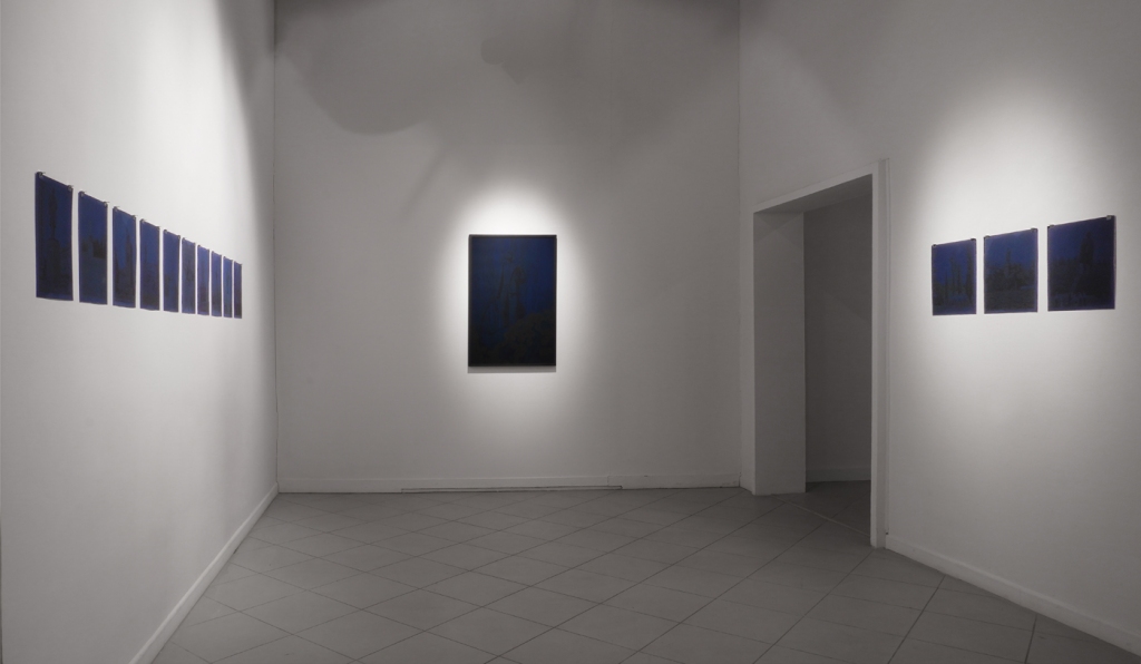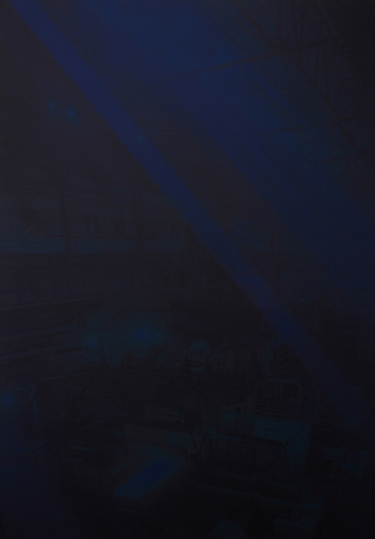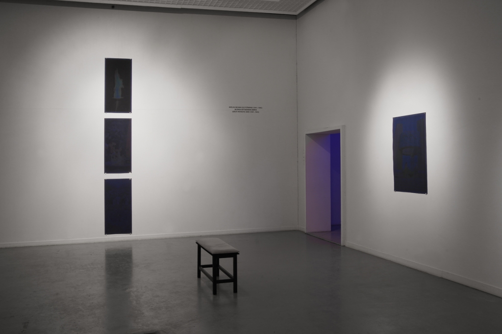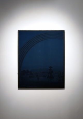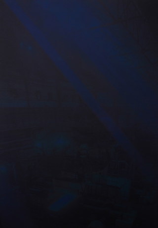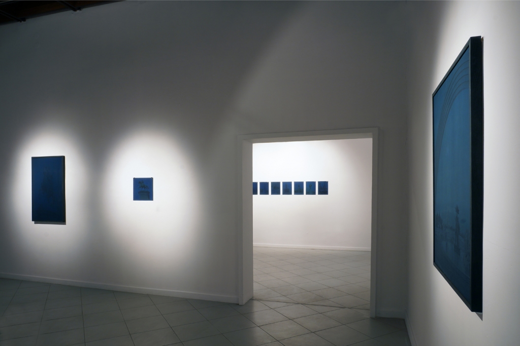 Postcards and photo albums were one of the methods of reinforcing the presence of propagandistic content. They were an important part of their distribution, as evidenced by the fact that their publication required multi-step approvals from the authorities. Biley enlarges them and creates works with the use of cyanotype – a photographic technique in which, when exposed to light, an image in a shade of Prussian blue is obtained, creating a twilight effect. The works look as if the photographs were taken after dusk or at dawn. The artist deliberately does not clarify this. He obscures the images of the objects and structures that created a false narrative. In recent years, most propaganda monuments have been removed from public space and their message is perpetuated no longer through peaceful transition, but through wartime aggression. In addition to themes connected to the history of Ukraine from the period of the Soviet Union, the series also includes images of structures destroyed by the Russians after the invasion in 2022 – the Azovstal factory in Mariupol the port of Odesa, whether the world’s largest transport aircraft Mriya (An-255) – which are examples of the final solution, namely war as a continuation of the policies of Tsarist Russia and the Soviet Union towards the annexed countries. Also appearing is the Kachovets power plant, which was blown up by the russians on June 6, 2023 as a result of which the Kachov Reservoir dried up, hundreds of plant and animal species became extinct. It also led to a shortage of drinking water and drought in the entire region of southern Ukraine. Due to the flooding, the unique ecosystem of the Dnieper floodplains and downstream islands disappeared. Motor oil that leaked from blocks of the destroyed hydroelectric plant also became a threat. The catastrophe has been described as an “ecocide.”