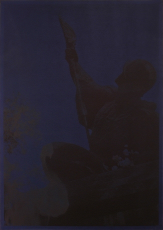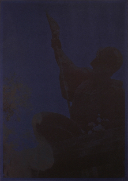 Wieczny płomień / Rzeźba Wojownik z flagą na Wzgórzu Chwały we Lwowie 1948–2023 2025, cyjanotypia, wydruk muzealny, 104x74cm, Solution Velvet White 270gsm