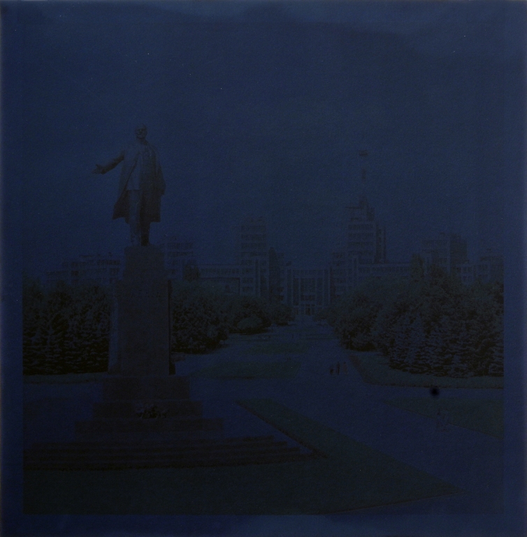 Pomnik Lenina w Charkowie 1963–2014 2025, cyjanotypia, wydruk muzealny, 32,5x32,5cm, Solution Velvet White 270gsm