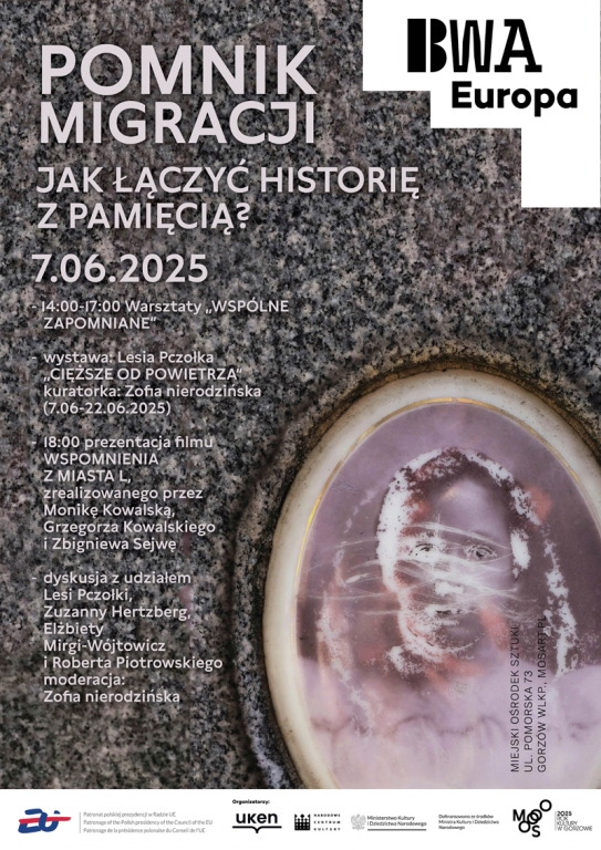 Po warsztatach odbędzie się prezentacja filmu pt. "Wspomnienia z miasta L”, zrealizowanego przez Monikę Kowalską, Grzegorza Kowalskiego i Zbigniewa Sejwę w 2004. Film opowiadada zapomnianą historię Gorzowa sprzed 1945 roku oczami jego niemieckich mieszkańców. Po projekcji nastąpi dyskusja pt. „Pomnik migracji. Jak łączyć historię z pamięcią?” z udziałem: Lesi Pczołki, Zuzanny Hertzberg, Elżbiety Mirgi-Wójtowicz i Roberta Piotrowskiego, którą poprowadzi Zofia nierodzińska.