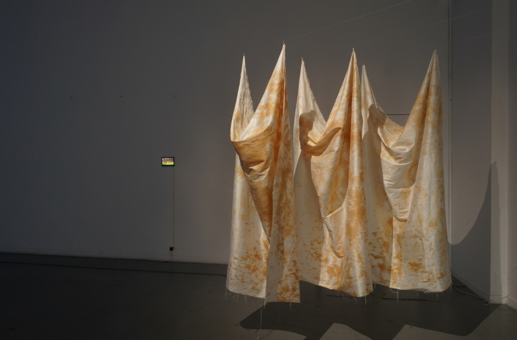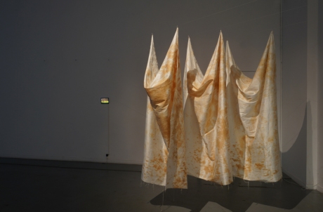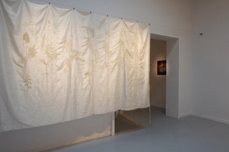Od lewej: Zasłona (za Baronem Ferencem Hatvany), 2018, zabytkowa rama / tkanina; Zasłona (za Baronem Mór Lipót Herzog), 2018, zabytkowa rama / tkanina