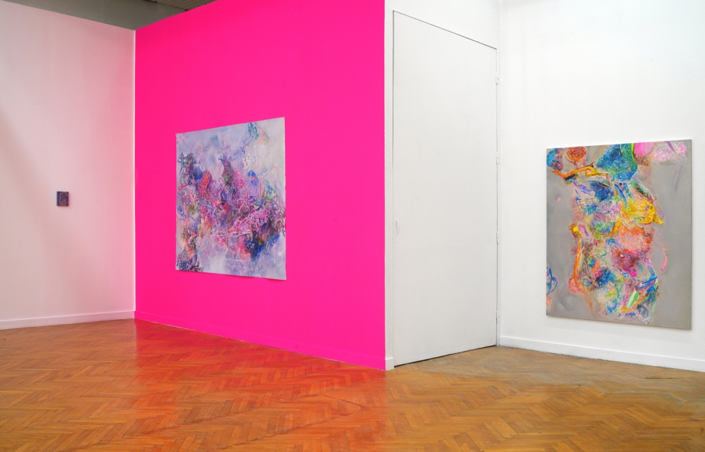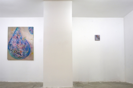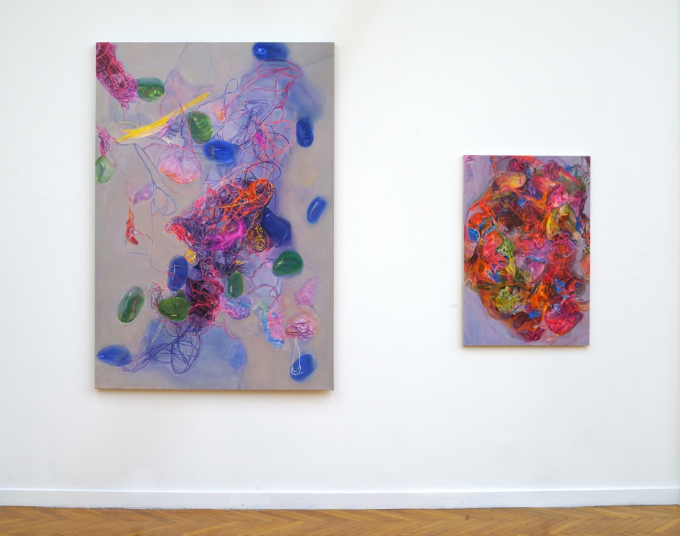 Od lewej: Plątające, akryl, olej na płótnie, 2025; Kamień jak serce II, akryl, olej na płótnie, 2025